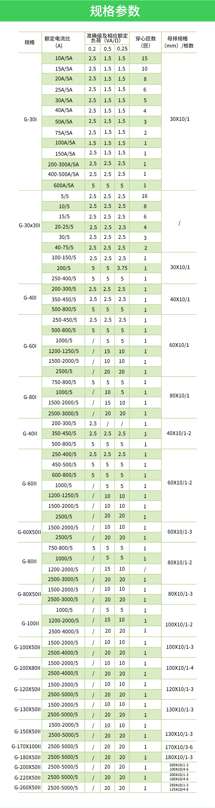 具体型号:AKH-0.66/G G-40I 400/5技术要求:额定电流比400A/5A;准确级0.2级;额定负荷2.5VA;穿心匝数1匝;内孔径φ30;母排规格40mm×10mm 1根。通讯协议:无辅助电源:无